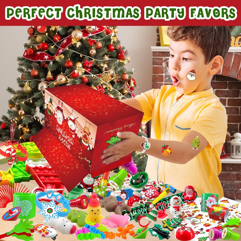 Get ready for a joyful Christmas celebration with our 250pcs Christmas toy set! Inside a beautifully designed gift box, you'll find an exciting assortment of 20 different toys, including fidget poppers, bracelets, squishy characters, keychains, and more, all designed to add extra fun to your holiday festivities. These toys are not just perfect for unwrapping during Christmas but also make fantastic party favors for kids. With a variety of 20 different toys, they are versatile enough to meet kids' different needs during various games and occasions, from carnival prizes to classroom rewards, and even stocking stuffers. Looking for the ideal Christmas gift for kids aged 4 to 12? Our Christmas party favors fit the bill perfectly. These versatile toys are suitable for various occasions, from Christmas stockings and decorations to Carnival and school awards. They are designed to bring endless joy to children during the holiday season, ensuring cheerful celebrations with family and friends. Planning to fill those Christmas goodie bags? Look no further! Our Christmas toy set offers a wide assortment of stuffed toys, making it the ideal choice for Christmas goodie bag stuffers for kids. These versatile items are sure to bring smiles to the faces of kids and guests, adding a festive touch to your celebrations. The fun doesn't stop there! All these toys feature charming Christmas-themed designs, including Christmas trees, Santa Claus, snowmen, reindeer, and more, which add to the holiday atmosphere. They are perfect for Christmas stocking stuffers, festive decorations, and children's Christmas party prizes. Make this Christmas unforgettable with our 250pcs Christmas toy set. Add some holiday magic to your festivities, and let the joyful celebrations begin