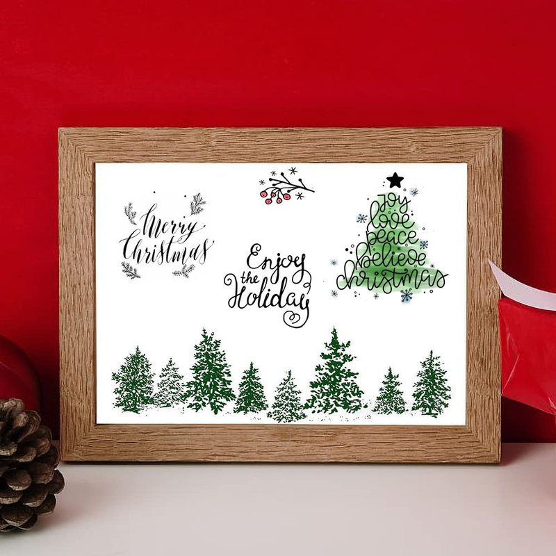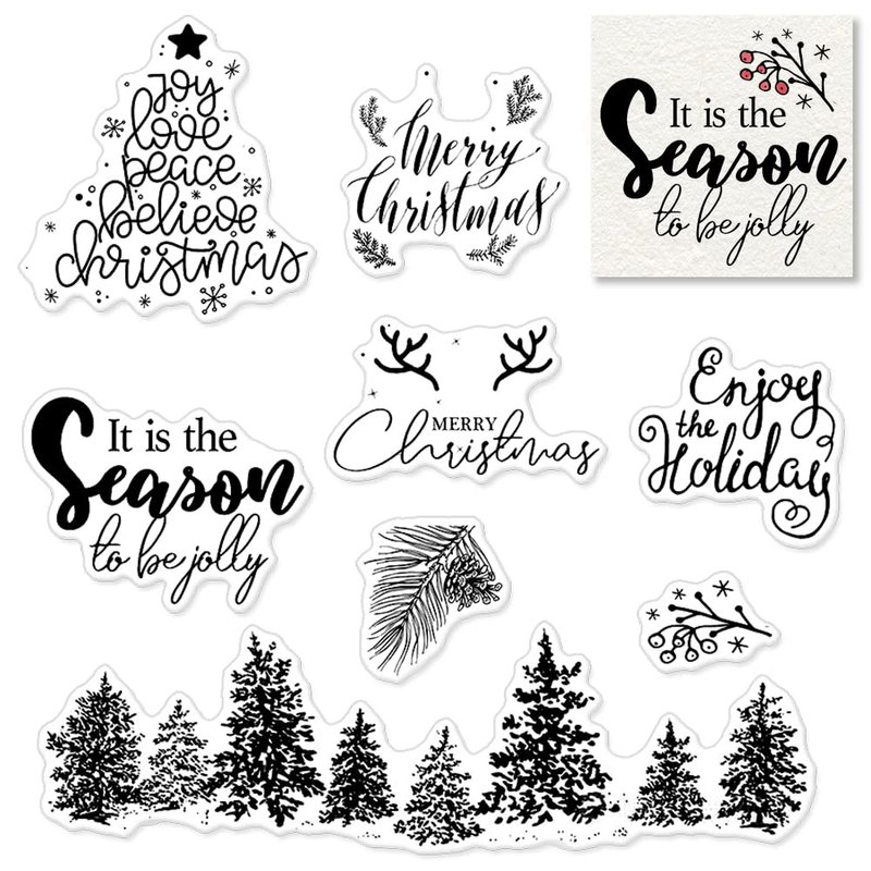 - Design: This is the Christmas clear stamp, including Christmas trees rubber stamp, words tree rubber stamp, Merry Christmas words rubber stamp, pine cone rubber stamp, antlers rubber stamp. You can use the rubber stamps for card, journals, crafts, decoration, Winter/Christmas/Happy new year gift or any other manual creations.