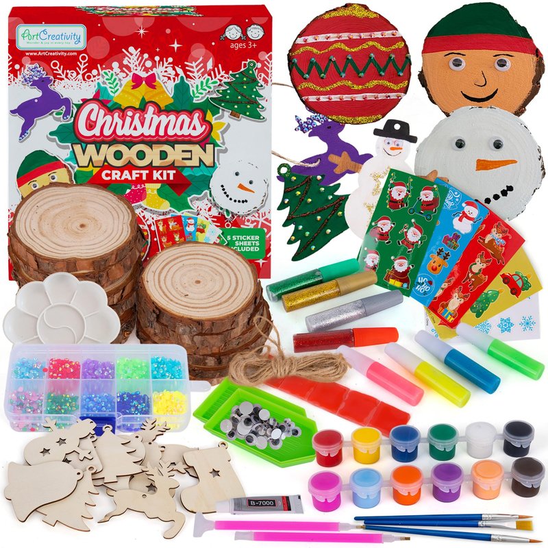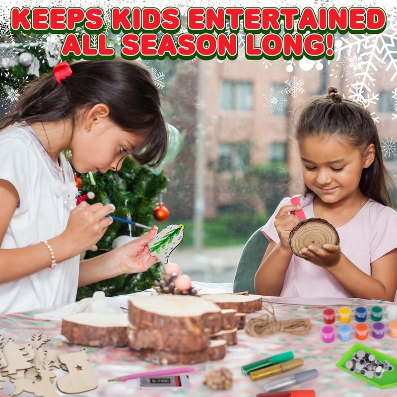 Christmas Wooden Ornament Craft - Includes 28 Ornaments - Wooden Painting Craft Kit for Kids & Adults with Wood Slices, Xmas Shapes, Glow in The Dark Paint, Gems, Glitter Glue, and Google Eyes
