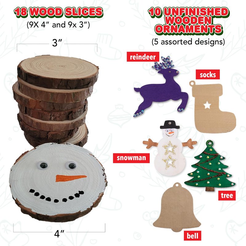 - 10 unfinished wooden ornaments with Christmas designs (tree, snowman, bell, reindeer)