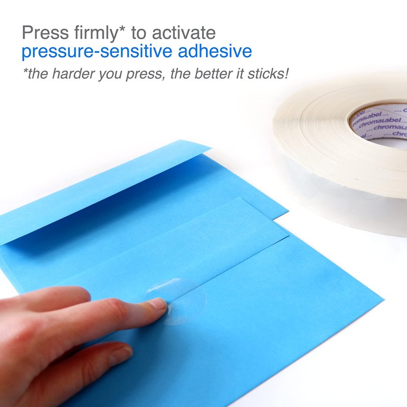 - Generous Size Clear Circle Labels; These crystal clear circle stickers are neatly wound on a 3-inch diameter core, providing 5000 total clear sealer tabs in a cleanly shrink-wrapped roll.