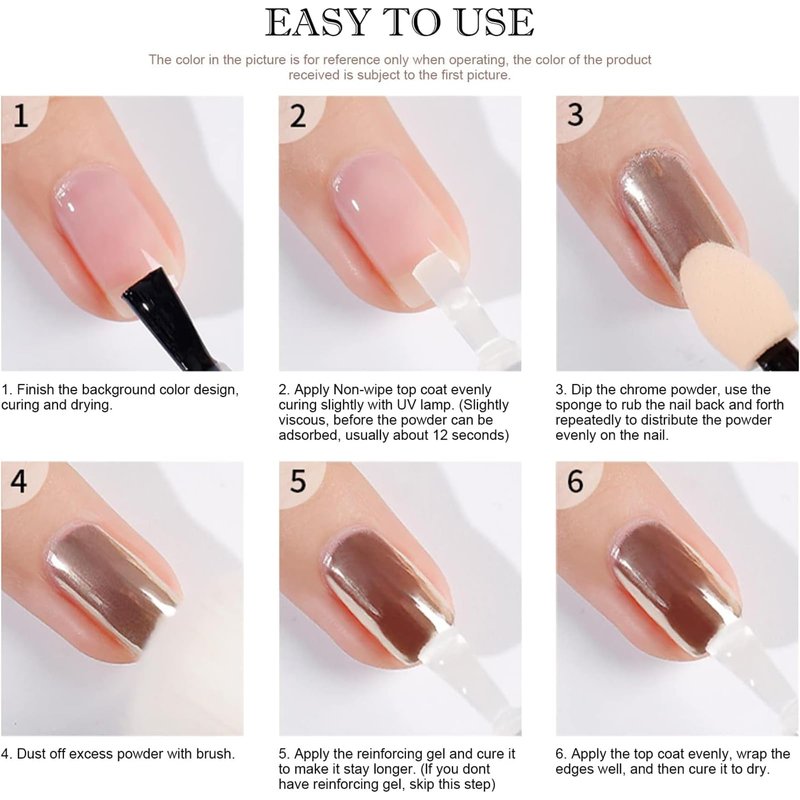 - Widely Used: The nail chrome powder is suitable to be applied on UV gel nails, nail tips, acrylic extension and natural nails. It can also perfectly match with nail flakes, nail charms, bubble effect, water ripple pattern, french manicure, 3D shell nails and etc. Suitable for various occasions such as parties, masquerades, bars, performances, salons, weddings, etc.