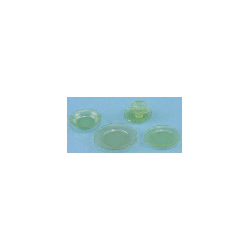 Complete your dollhouse and miniature collection with DEPRESSION DISH SET, 5PC, GREEN. We are your source for superior dollhouse miniatures. Dinner Plate Size: 3/4"Diameter . 5 piece placeSetting of dinnerware, color-green transparent.