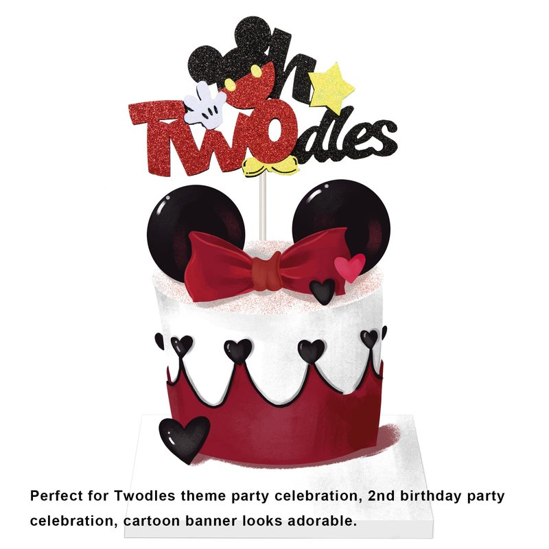 CHuangQi Oh Twodles Glitter Cake Topper, Mickey Themed 2nd Birthday Cake Decor, Second Birthday Party Supplies