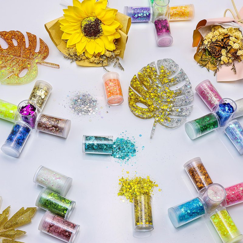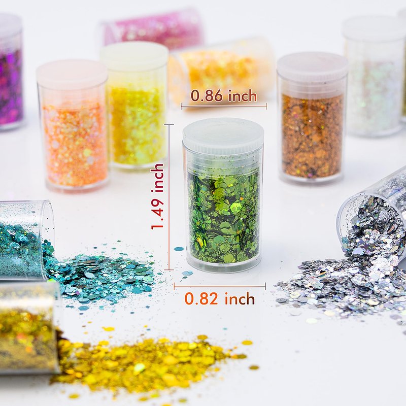 • ✅Wide Application Chunky Glitter: With combination of chunky glitters and fine glitters, different sizes of glitter sequins mixture not only gives you the sparkle effect on resin crafts and festival decoration, slime fillers, tumbler glitter and other DIY crafts, but also suitable for acrylic nail glitter, festival makeup for face, eyes, nail, hair, lips, body glitter and more.