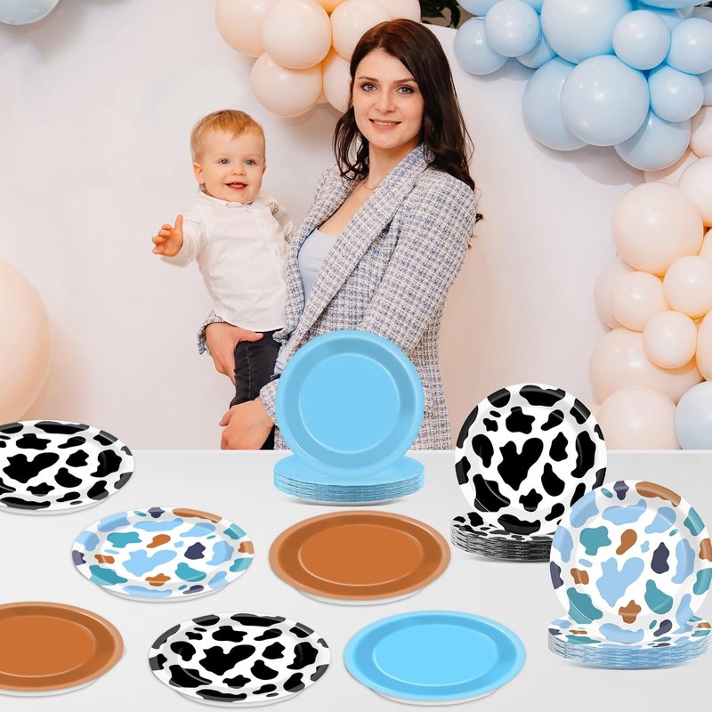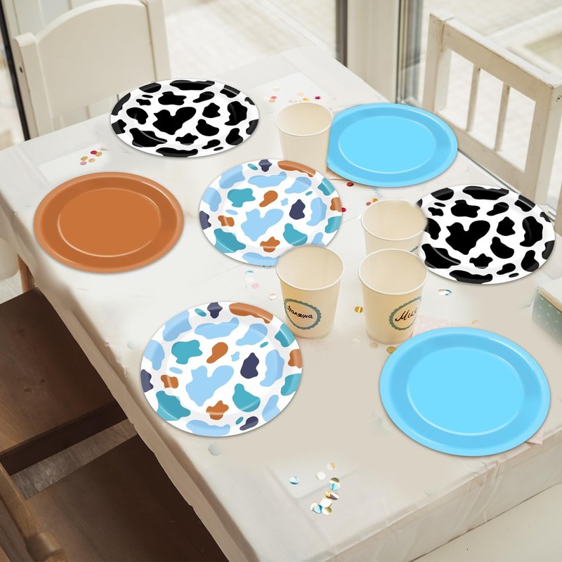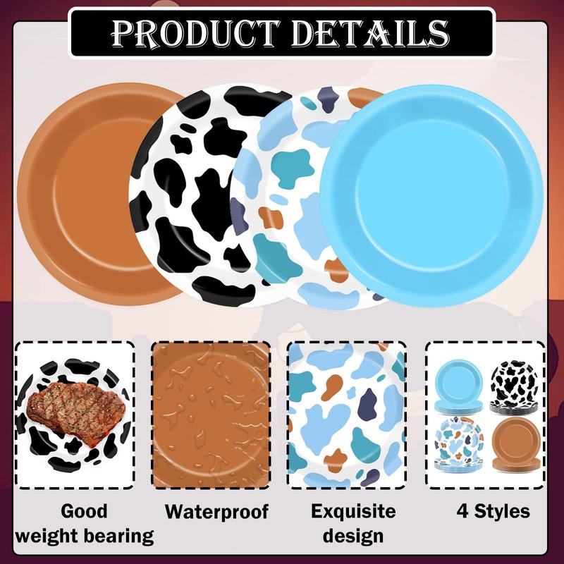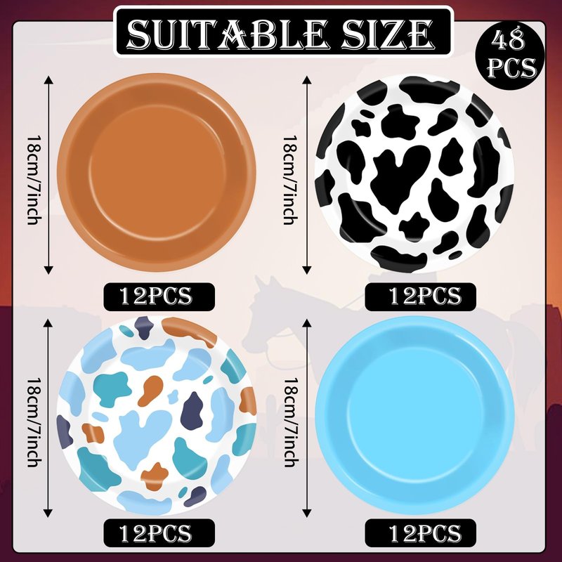- Western cowboy party design: This western toy plate set features 4 designs: black cow print and blue cow print patterns, blue and brown colors. Western cowboy party plates add a touch of whimsy and fun to your western cowboy party and leave a lasting impression on all your guests.