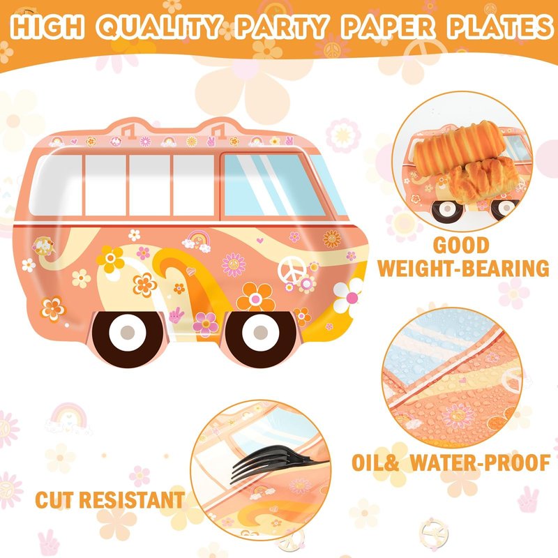 - Packing content: These groovy party decorations include 50pcs retro hippie bus dessert plates. Brighten up your table setting with our groovy hippie peace bus dinner plates that exude an appealing and cheerful atmosphere, ideal for your hippie party or birthday party.
