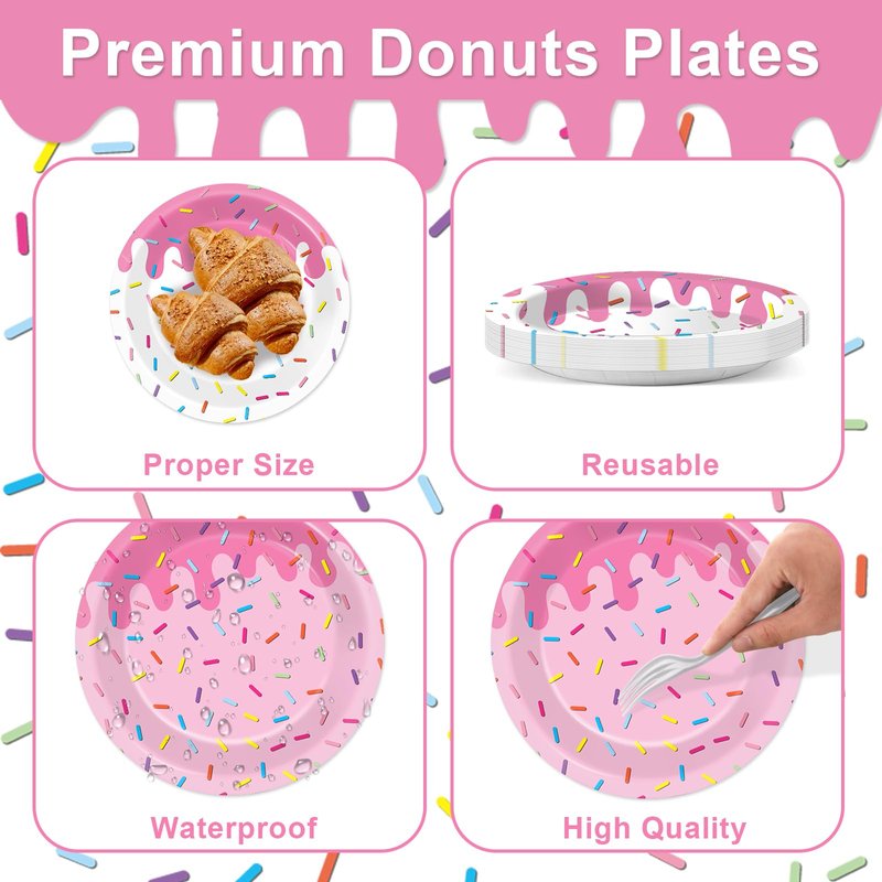 - Package includes: You'll get 24 pieces of 9in donut party paper dinner plates, 24 pieces of 7in sweet donut dessert plates, 24 pieces of pink donut party napkins of 6.5in, and 24 pieces of plastic white forks for each set that can serve 24 guests, creating a visually stunning table decor for your birthday party and events.