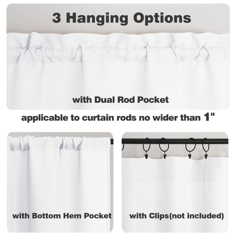 Size & Quantity: Each pack contains 2 pieces, each 30" wide and 36" long, total width is 60", total length is 37.5" including 1.5" header. The 2" rod pocket fits most curtain rods, which make the short tier curtains easier to hang or slide. High Quality Tier Curtains: These elegant white half window curtains are made of thick and heavy-duty faux linen textured fabric, which feels soft and goes well with any room style. Light Filtering Curtains: These semi sheer 36 inches curtains are sheer enough to let some light in but also thick enough to softly filter out glare sunlight and offer just the right amount of privacy. Perfect for living room, bedroom, study, kitchen cabinet, bathroom, basement, cabin and RV camper small windows. 2-Way Hanging Options: Hang these curtains (1) from the 2" rod pocket for a classic casual look, or (2) using clip rings for easy, slide open and closed (clip rings are not included). Machine Washable: Machine wash cold in gentle cycle with like colors. Only non-chlorine bleach when needed. Tumble dry low. Remove promptly. Cool iron as needed.