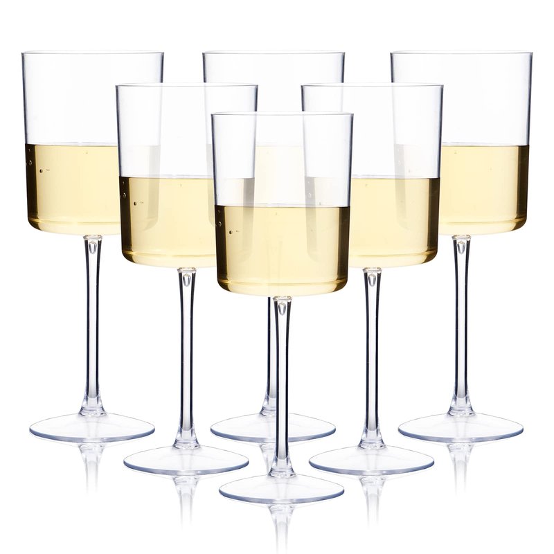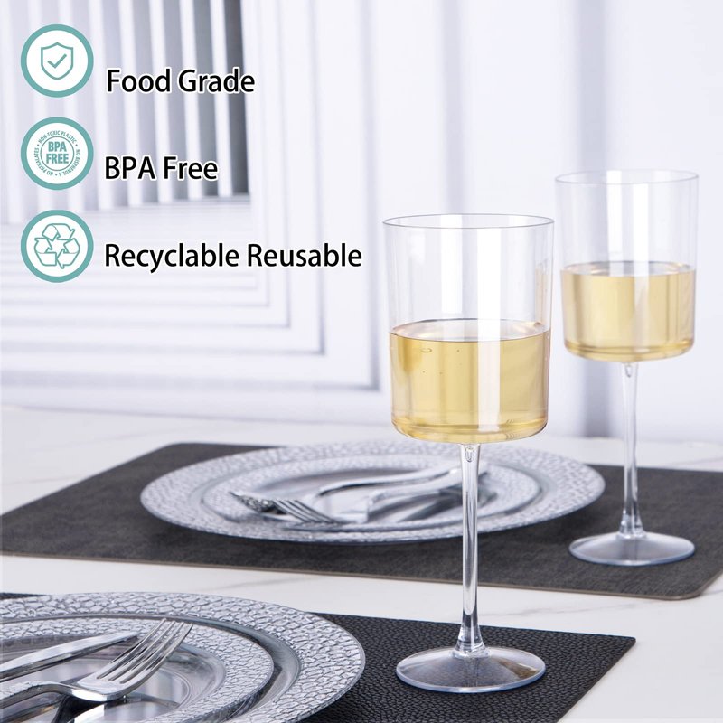 Size: 6 Pack Plastic Wine Glasses 10 oz Our plastic wine glasses have eye-catching shapes to make your drinks look premium, and these plastic wine glasses with stem support reuse, are sturdy and durable, and can be used outdoors, at parties, weddings, barbecues, picnics, and are great value for money!