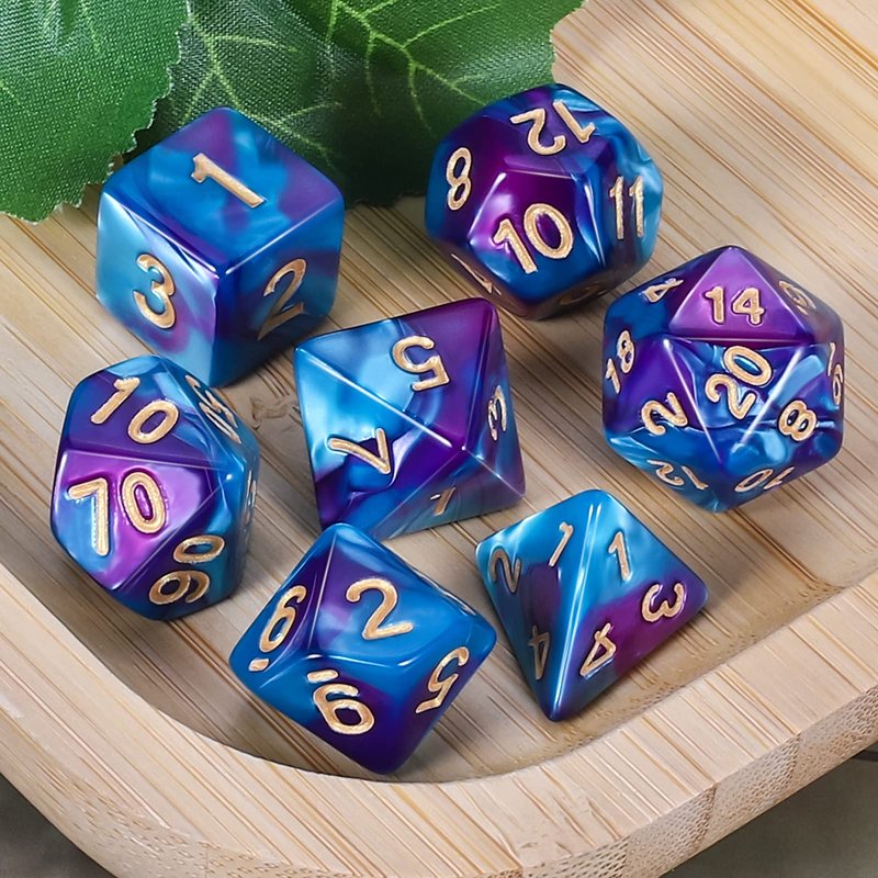 - 🎲 7pcs Polyhedral dice set: Contains one d20, one d12, two d10 (00-90 and 0-9), one d8, one d6 and one d4 and a velvet dice bag.