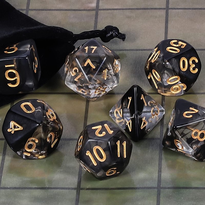 - 🎲 7pcs Polyhedral dice set: Contains one d20, one d12, two d10 (00-90 and 0-9), one d8, one d6 and one d4 and a velvet dice bag.