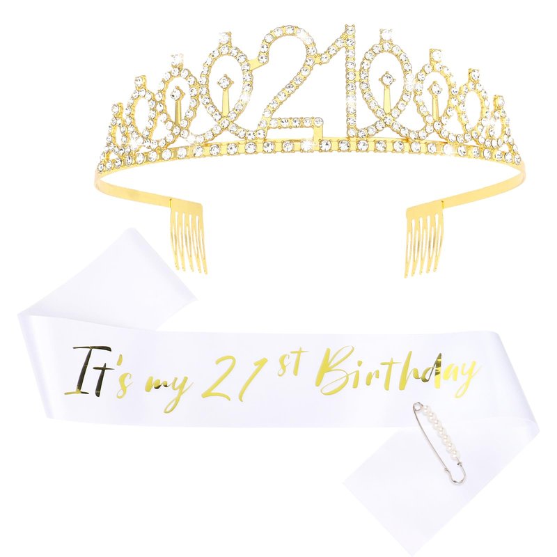 - The Perfect 21st Birthday Decorations for Her: 21st birthday sash + rhinestone 21 tiara gold.
