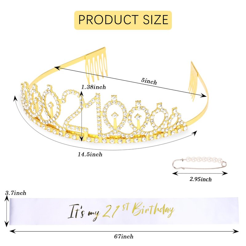 - 21st Birthday Crown and Sash Material: Alloy, rhinestones, satin fabric, pearl pin. The crown material is sturdy and shiny. This is a high quality birthday decorations set that is essential for 21st birthday parties of various themes.