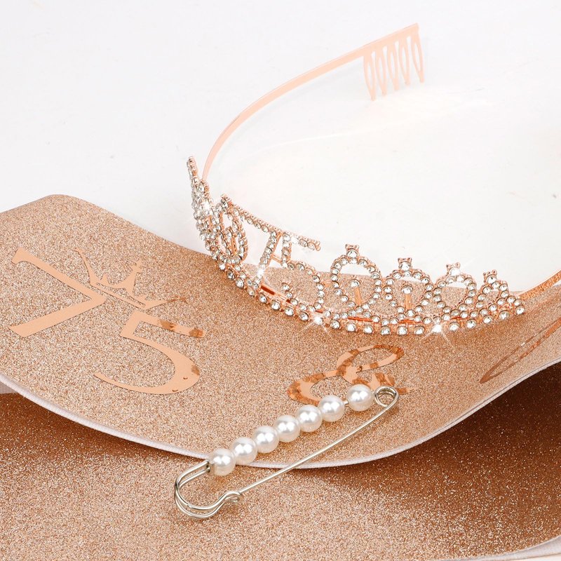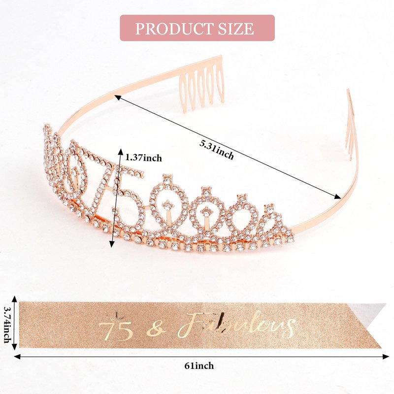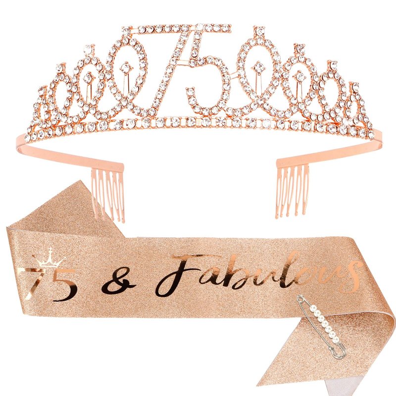 - The Perfect 75th Birthday Decorations for Women: "75 & Fabulous" birthday sash + rhinestone 75 tiara rose gold.