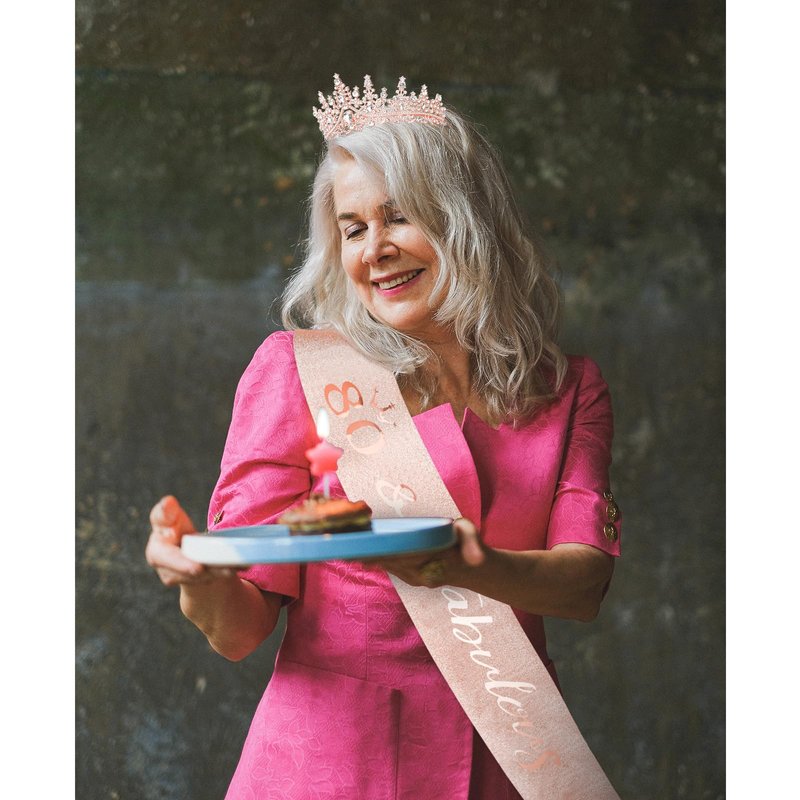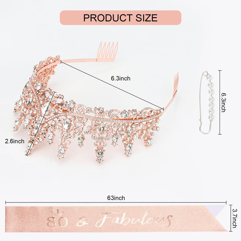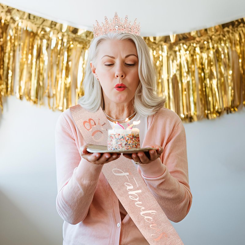 - The Perfect 80th Birthday Decorations for Women: "80&Fabulous" birthday sash + rhinestone tiara rose gold.