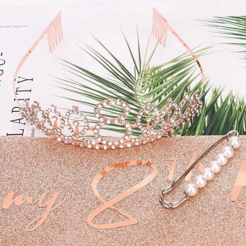 - One Size Fit All - Birthday sash - Length: 61” (155cm), Width: 3.7” (9.5cm); Rhinestone tiara are adjustable as well comes with comb design that can holds and stable and comfortable on top of the hair. Birthday sash can be fixed and adjusted in length with pearl pins .