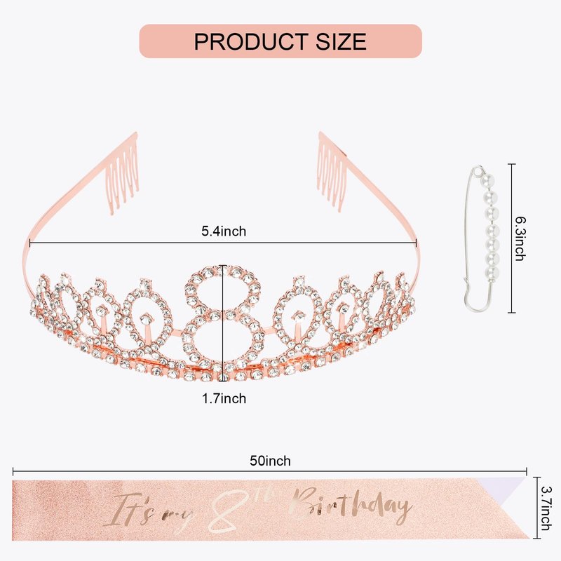 - 8th Birthday Crown . It is a dazzling and beautiful tiara for girls. With the shiny, attractive, beautiful rhinestones paved on the crown,your feeling like a princess when wearing it. Make the most stunning at any occasions decorated for the special birthday girl.