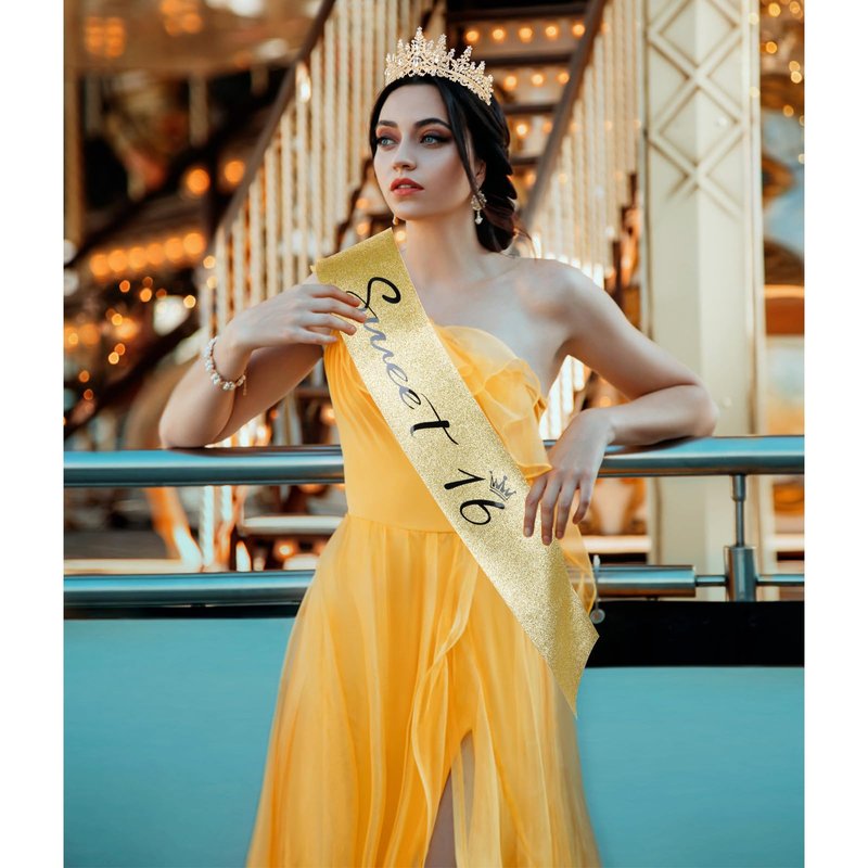 - Sweet 16 Sash. Birthday sash made from soft glitter fabric using hot pressed stamping foil will compliment any outfit and durable enough to last day into night. Gold glitter sash + black lettering looks great on photos...It's perfect for those who obsesses over the perfect shot for Instagram.
