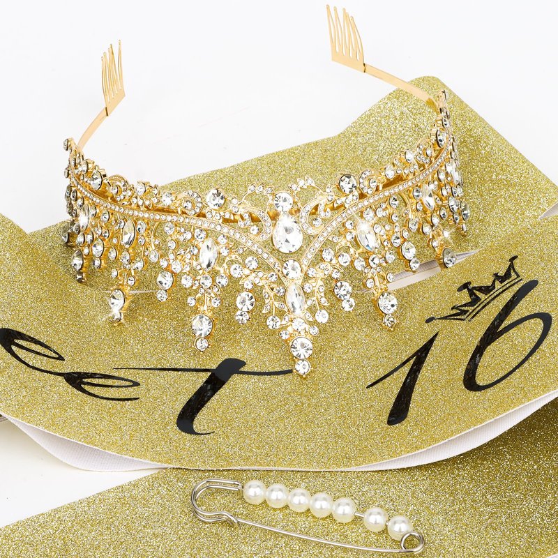 - The Perfect Sweet 16 Party Decorations for Girls: "Sweet 16" sash + rhinestone tiara gold.