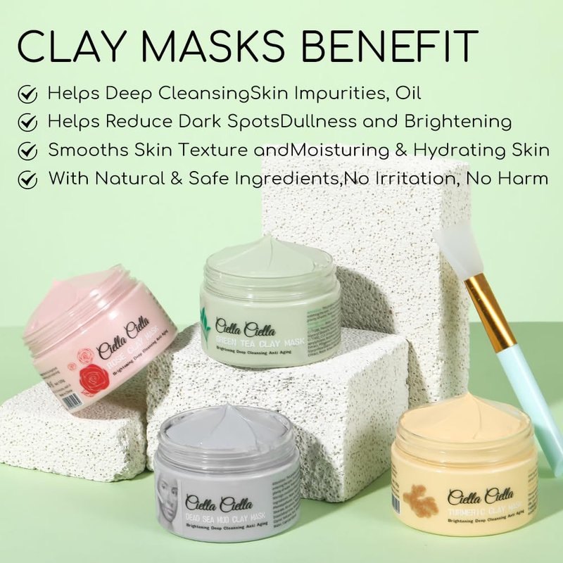 Ciella Ciella 4pcs Clay Mask for Face,Dead Sea Mud Mask,Mud Masks for Face,Pore Cleansing Mask,Facial Masks for Women Skin Care,Green Tea Face Mask,Tumeric Face Mask,Rose Face Mask(16.93oz)