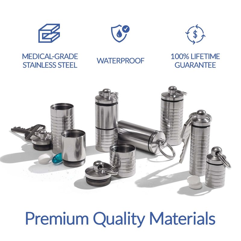 - Made of Superior Solid Materials - You deserve a pill container keychain that’s as tough and resilient as you are. Our mini pill holders are crafted with your choice of either stainless steel or titanium. Both high-grade materials outlast repeated use and the harshest conditions—they won’t easily break.