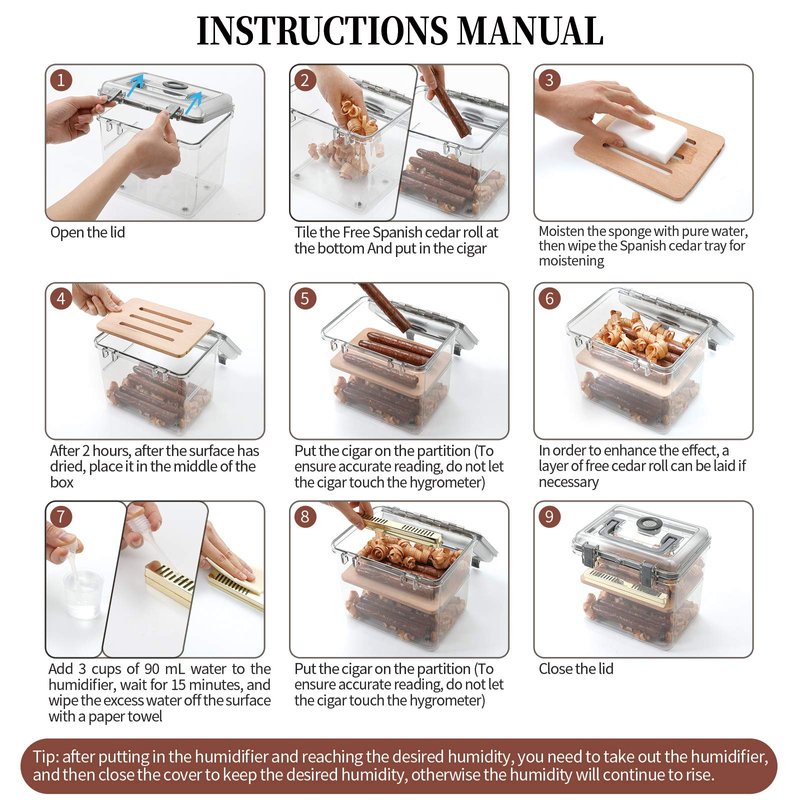 - Abundant accessories: humidifier, digital hygrometer (no need to install) a piece of authentic cedar wood (not stickers), and a pack of handmade cedar rolls.Does not contain cigar.
