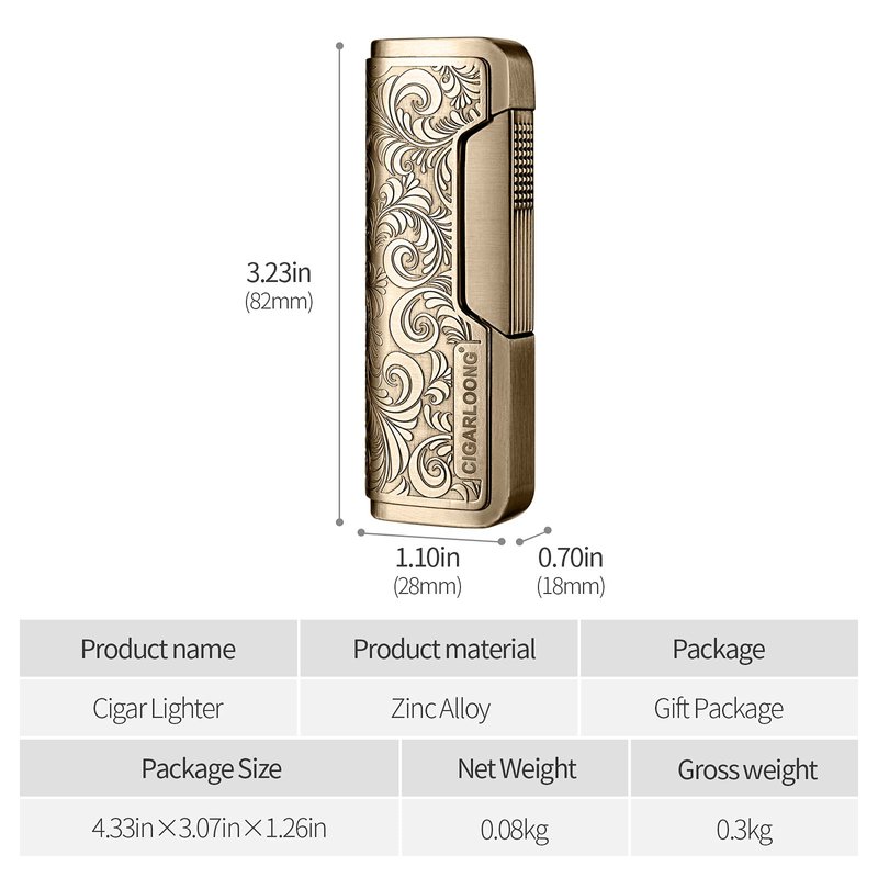 CIGARLOONG Engraved Cigar Lighter Pocket Windproof Flame Refillable Butane Lighter,Without Gas(Silver)
