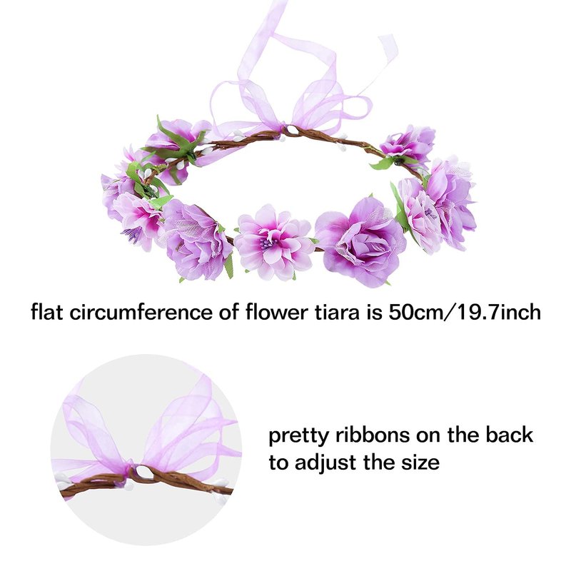 - 【ONE SIZE】--You can see the original circumference (approx 53cm/21") of the flower wreath in the photo on the left, but they can fit for most both women and girls because there are two ribbons on the back to adjust the size. There is no need to worry about size problem.
