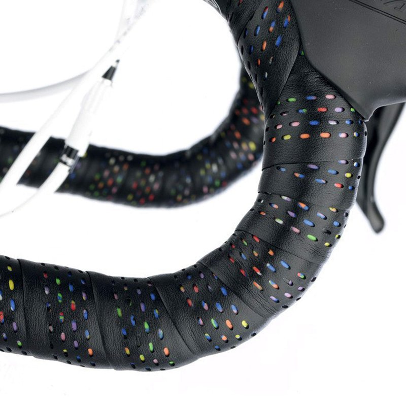 - Multicolored EVA foam backed bar tape with a solid black perforated cover.