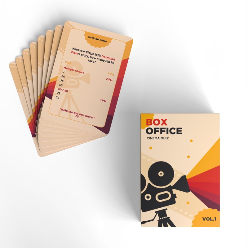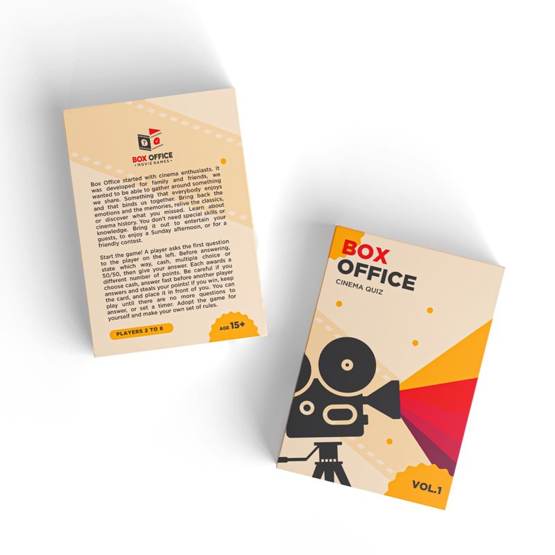 Introducing "Box Office: Cinema Quiz Vol.1" – the ultimate trivia card game that takes you on an epic journey through cinema! Whether you're a casual moviegoer or a film buff, this game is designed to entertain and challenge players of all ages and backgrounds. Gameplay: "Box Office" offers a unique blend of strategy and knowledge. Each player or team can choose from three different ways to answer a question, adding an extra layer of excitement to the game. Will you risk it all with the "Cash" option, play it safe with "Multiple Choice," or go for the middle ground with "50/50"? The choice is yours, and each option awards a different amount of points. Categories and Themes: Immerse yourself in the magic of cinema with questions spanning iconic franchises like Harry Potter, Lord of the Rings, Jurassic Park, Indiana Jones, Star Wars, and more. Explore diverse categories such as actors, directors, famous lines, and awards, ensuring a rich and varied gameplay experience. With different difficulty levels, " Box Office " accommodates players of all knowledge levels, making it an inclusive and engaging game for everyone. Solo or Team Play: Whether you're a lone film enthusiast or part of a movie-loving squad, " Box Office " adapts to your preferences. Challenge yourself in solo play or form teams for a lively, collaborative experience. The game's flexible format encourages players to enjoy it with friends, family, or fellow cinephiles, fostering a sense of togetherness across generations. Bringing Generations Together: Built to bridge generation gaps, " Box Office " celebrates the timeless appeal of cinema. The game's diverse range of questions ensures players of all ages can contribute and enjoy the experience. You don't need to be a cinephile to have a blast – just a love for movies and a sense of fun! Customizable Rules: " Box Office " encourages creativity by allowing players to devise their own set of rules and alternative ways to play. This feature promotes endless replayability, ensuring each session feels fresh and exciting. Get ready for an unforgettable cinematic journey with "Box Office: Cinema Quiz Vol.1" Whether you're reliving classic movie moments or discovering new ones, this game guarantees hours of entertainment and laughter for movie lovers. Gather your friends, grab some popcorn, and let the cinematic battle begin!