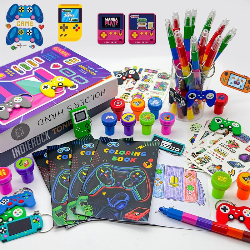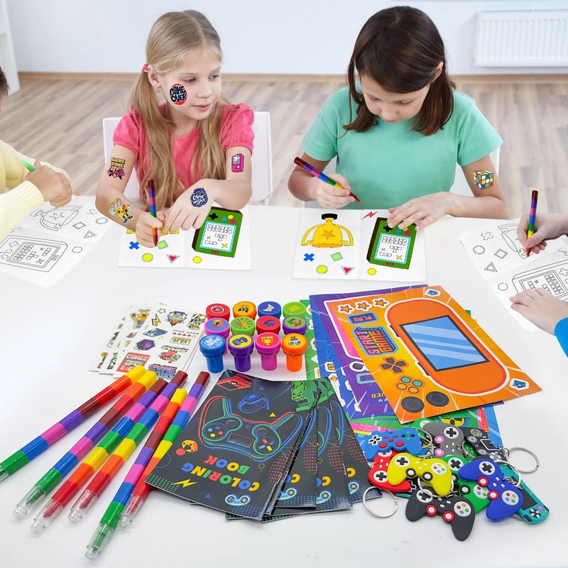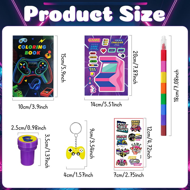 - Size Information:video game on party supplies coloring books is about 4X6 inches,tattoo stickers are about 2.68 x 4.72 inches, and 8 different colors pencils is about 7 inches,stampers are about 1 x 1.38 inches, sticker is about 2 inches, keychain is about 2 inches
