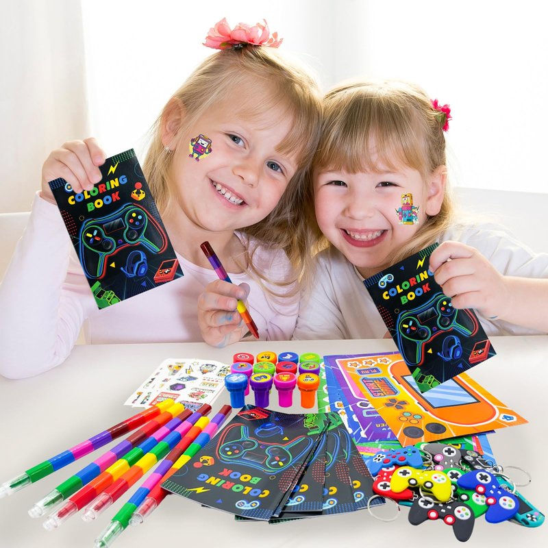 - Video Game Party Favors Set: our game coloring book with crayons bulk includes 12 coloring books(12 pages per book), 12 rainbow pencils(8 colors), 12 stampers, 12 DIY Art Craft stickers,12 Tattoos,12 keychains, and various styles enrich your travel birthday party