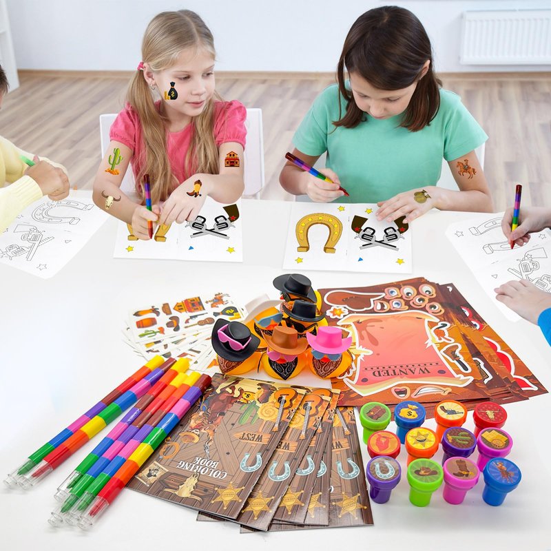- Western Cowboy Party Favors Set: our western cowboy coloring book party favors bulk includes 12 coloring books(12 pages per book), 12 rainbow pencils(8 colors), 12 stampers,12 Tattoos,12 DIY craft stickers,12 ducks,and various styles enrich your western cowboy birthday party