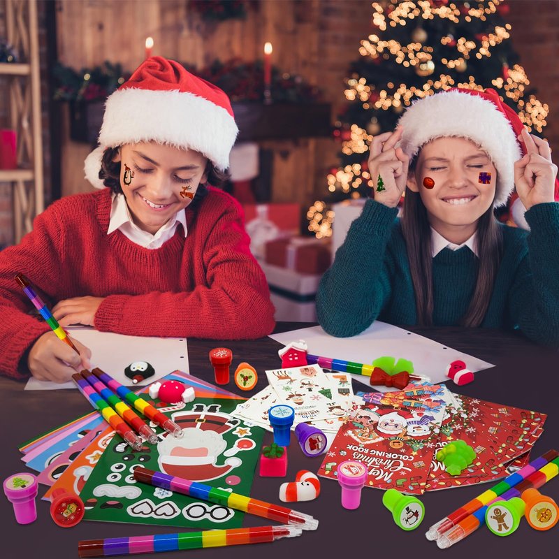- Christmas Party Favors Set: our Christmas school DIY set includes 12 coloring books(12 pages per book), 12 rainbow stacking crayons(8 colors),12 tattoos, 12 stampers, 12 DIY Art Craft stickers, 12 Christmas pattern squishy pinch gift, sufficient quantity, and various styles enrich your school Christmas party