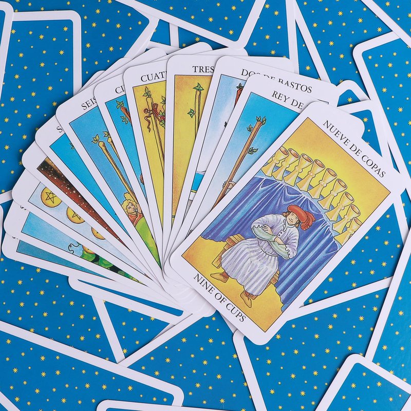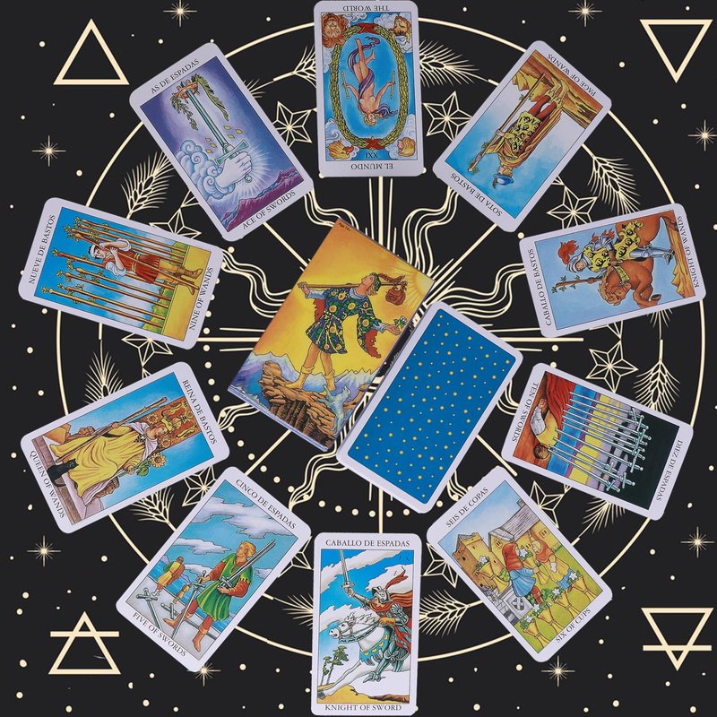 Bilingual Markings: The tarot deck is marked in both Spanish and English.