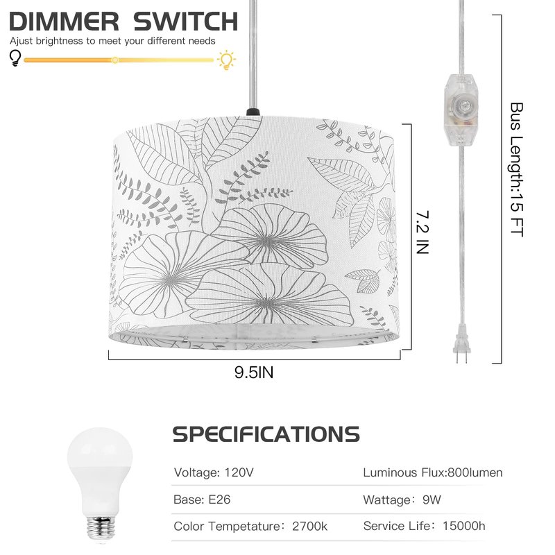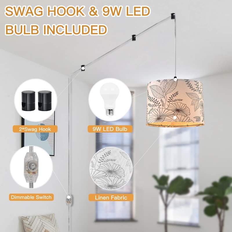 - 【9W LED Bulb】Hanging plug in light comes with a 800 lumen, 2700k LED bulb and 2 modern style swag hook, which saves you $10, you don't need to buy extra and start your experience early on contrary to other fabric pendant lamps! Besides, the pendant lamp adopts American standard E26 base, UL certification. Compatible with incandescent (60W)/LED (13W)/ CFLS (13W)/ halogen lamps (43W).
