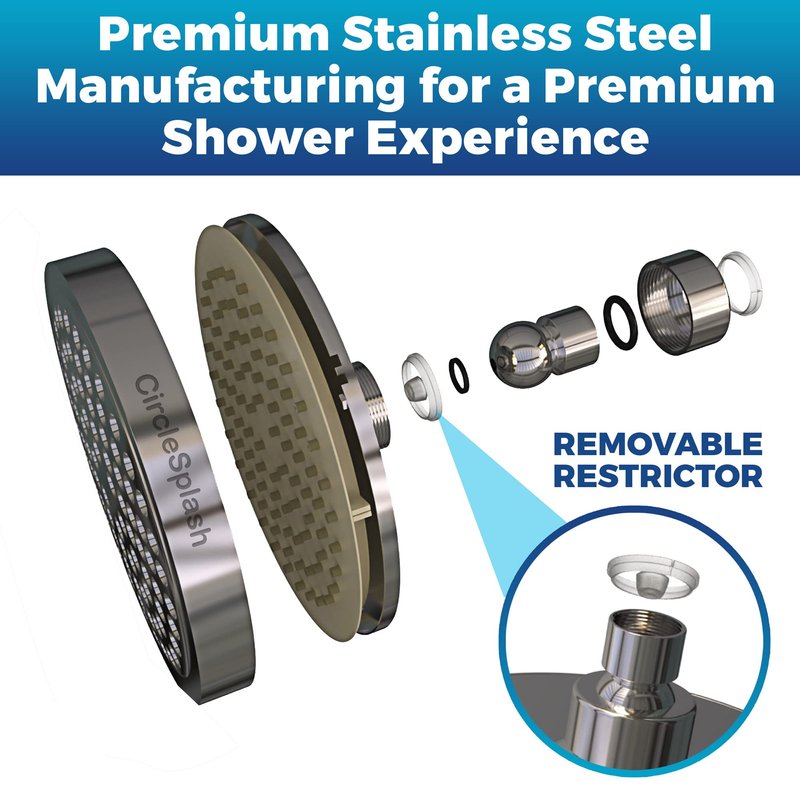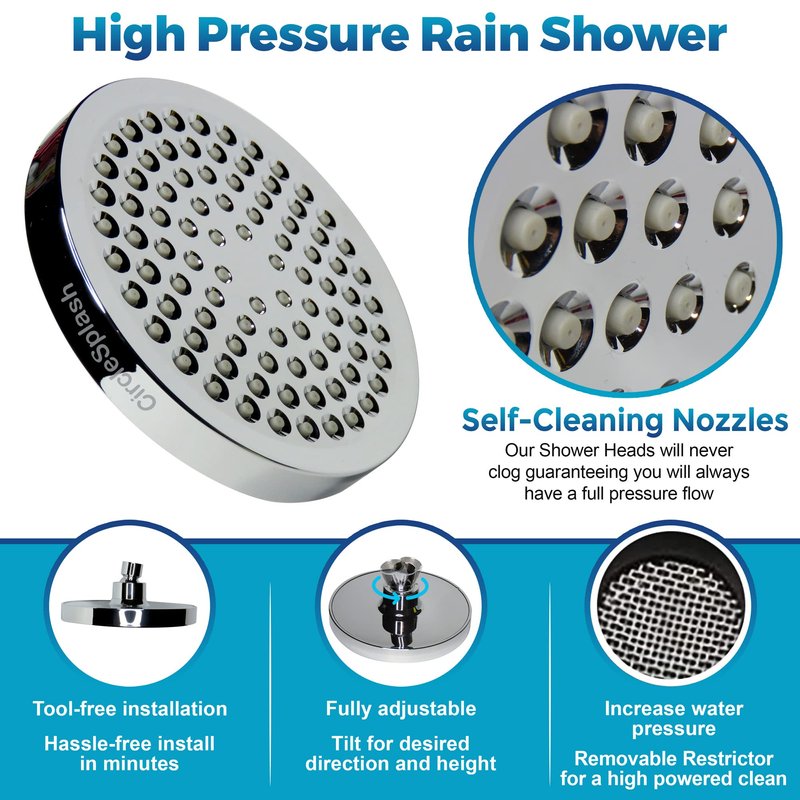 Find your Happy Place Your morning shower is the part of the day that’s just for you and your thoughts. Why not make it the best thing to wake up to? The Rain shower head from CircleSplash offers this and much more. 90 silicone jets provide not only a powerful 2.5 GPM but are also self cleaning. That is right, no water droplet stains to remove and no clogging. Put away that corrosive cleaner and enjoy the massage. Affordable For a fraction of the price of the big-name brands you can have a modern simplistic addition to your bathroom fixtures. With a sparkling chrome finish. The CircleSplash looks like you paid 3 times as much for your shower head. Easy to install You will not need to hire a plumber to install it. Simply find the Teflon Tape included in the box and wrap it around the threads of the shower arm. This will make a watertight seal. Twist the showerhead clockwise and gently tighten it. Turn on the water and watch for leaks. If you see one, unscrew the shower head, thoroughly dry off the threads of the shower arm and add another layer of Teflon tape. Now reinstall the showerhead and turn on the water again. That is where the value is, you did it without a Plumber Maybe you want to remove the water saving restrictor, this will use a little more water but will give an invigorating hot massage! First gently remove the mesh sand filter with a pair of needle nose plyers. Then with the plyers reach downward, pull firmly outward until it is disengaged from the shower head, then reinstall. It is that easy.100% Satisfaction guarantee We have got you covered! Worry Free 30-day moneyback if you’re not completely satisfied 1-year manufacturers full replacement warranty Like what you see? Click Add to Cart at the top right of the page