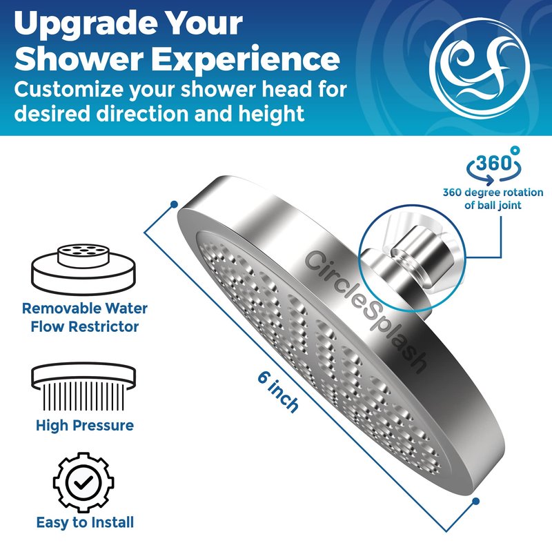 CIRCLESPLASH Shower Head - High Pressure Rain Booster - Anti Clog Self Cleaning Overhead Showerhead - Tool-less 1 min Install - Universal Replacement Chrome Finish - Rainfall 6 inch
