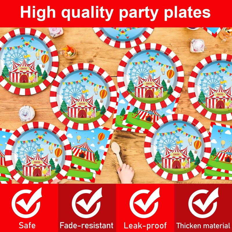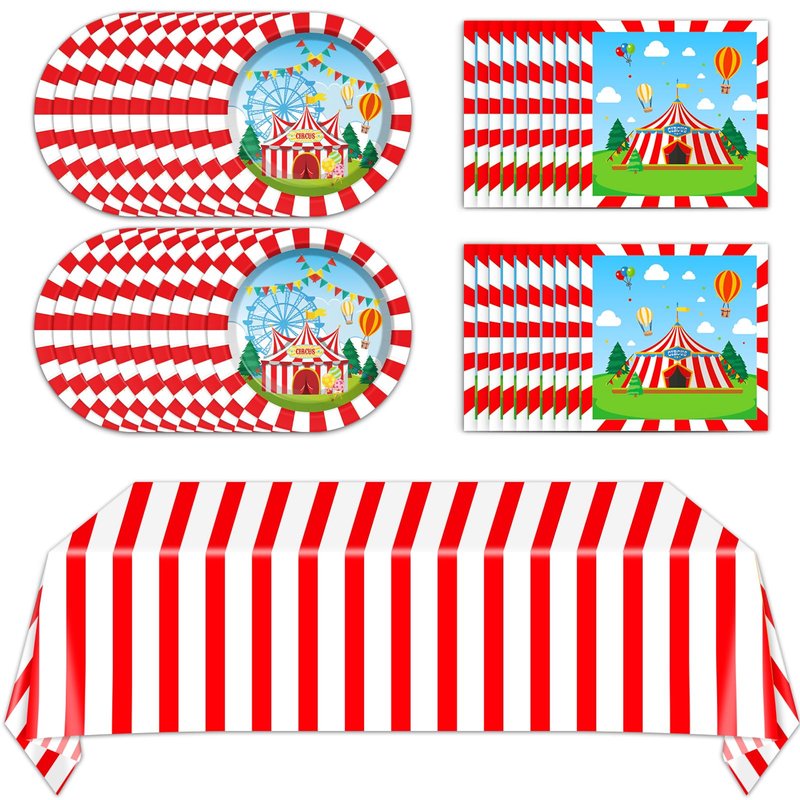 - What you will get: Our circus party supplies include a total of 41 pieces of disposable tableware. You will get 20×7 Inch plates, 20×napkins, 1×table cloth. Great for circus party and birthday party.