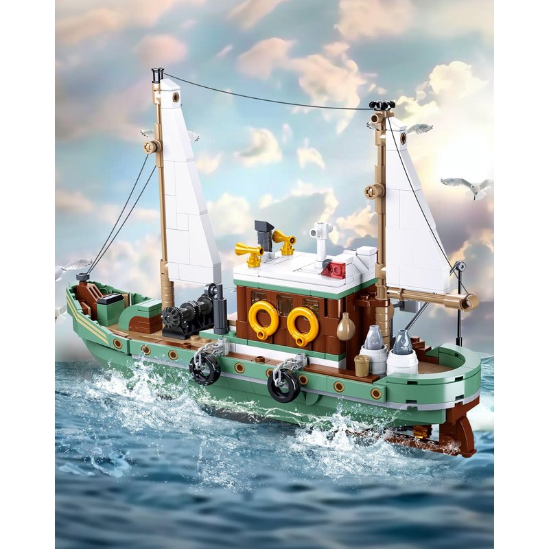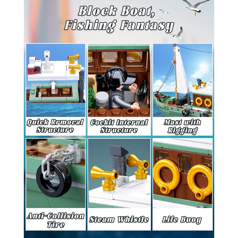 - Intricately Designed Fishing Ship- Featuring a Mast with Rigging, Steam Whistle, Anti-Collision Tire, Display Stand, and Life Buoy, each component of this fishing boat building set aims to immerse you in an authentic fishing adventure