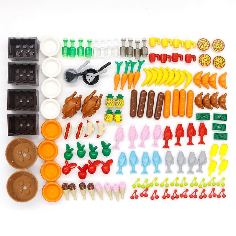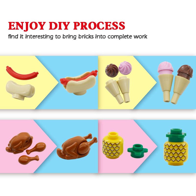 foods accessories bricks blocks set compatible with all major brands, which arouses kids' curiosity to role play of cooking in the restaurant and holding party with their friends.