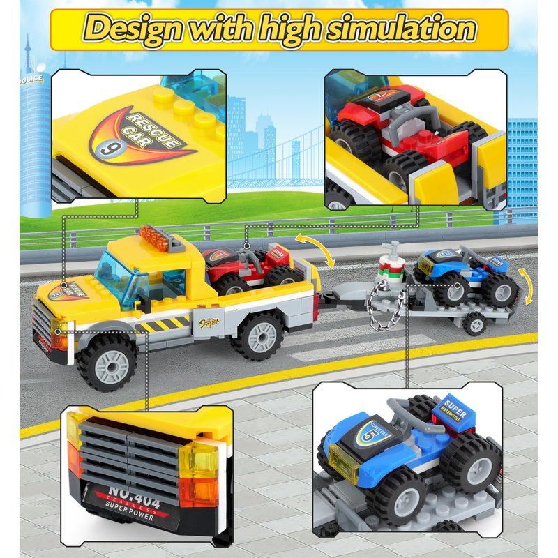 - 【 Package Include 】 The item comes in an exquisite gift-wrapped box containing a total of 324 pieces blocks. After being fully assembled, this toy contains a rescue trailer and 2 off-road vehicles.