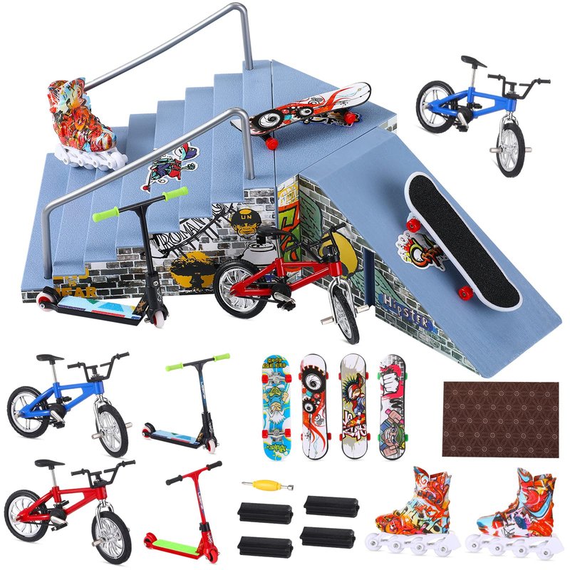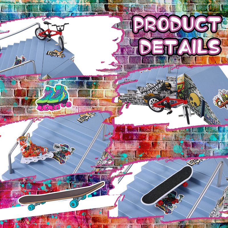 - Full Experience Fingerboard Skatepark Set: you will get 3 pieces of skateboards, 5 pieces of mini finger skates (random styles and colors), 3 pieces of skatepark stickers, 4 pieces of scene combo accessories, 1 piece of screwdriver, 1 pair of thumbskates, 2 pieces of fingerboard bikes, 2 pieces of scooters, 2 pieces of skatepark handrails, 1 piece of large non slip mat, totally 24 pieces, enough to make your skate ramp more interesting