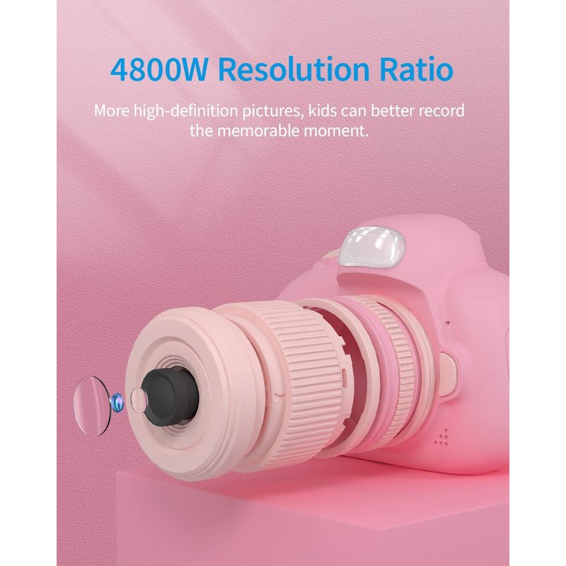 - šć2.4-inch LCD Screen, Front And Rear Dual Camerać The kids selfie camera with a 2.4-inch display, compared to other kids cameras with a 2.0-inch display, can take a wider field of view and take clearer photos. Enhance children's shooting experience; with the front and rear dual cameras, it can easily take pictures. The picture is 48 megapixels and the camera is 1080P, which greatly improves the clarity of photos and videos. With Big head sticker shooting, kids can leave hilariousand funny photos