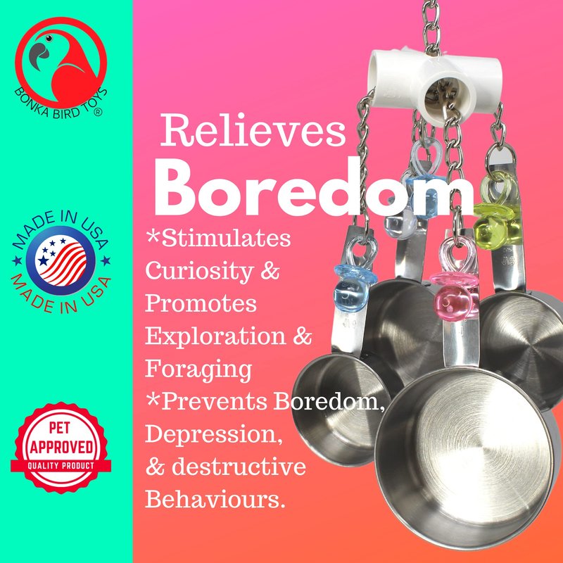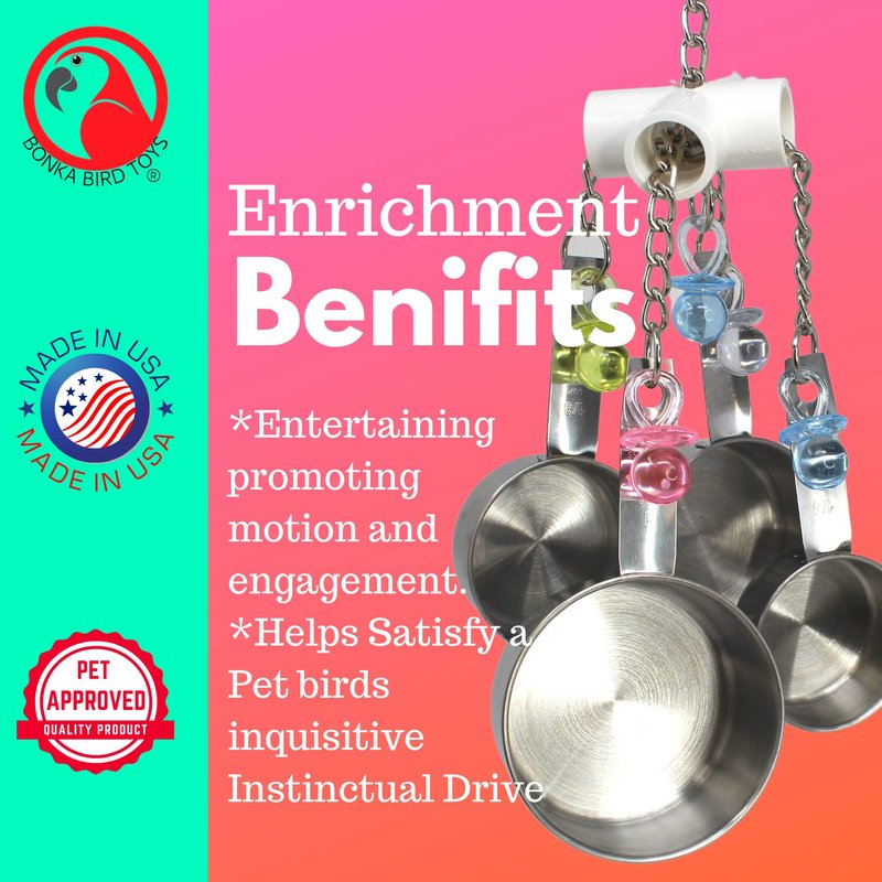 - The bird toy has (4) heavy duty high quality stainless steel measuring pots that are great for beaks.