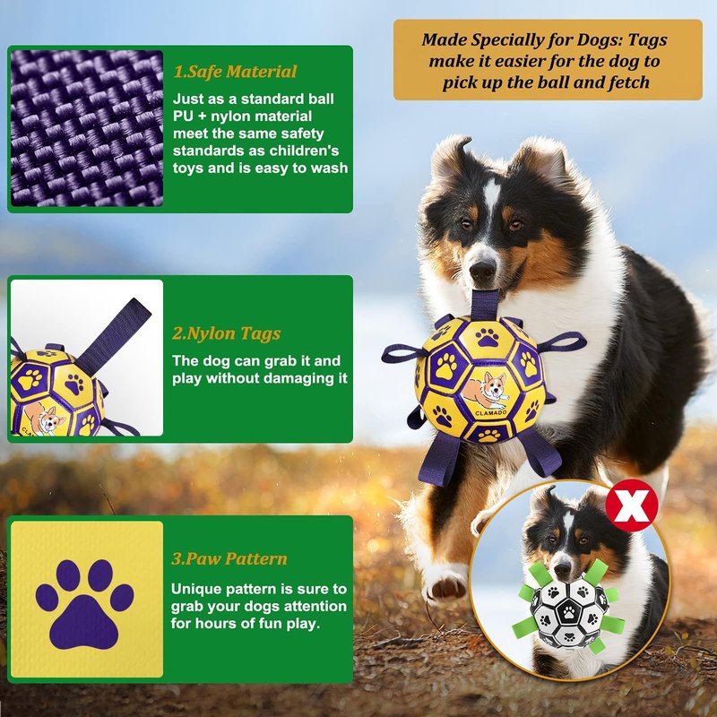 - Upgrade Interactive Dog Toy: Dog soccer ball with nylon tabs sewn evenly into the seams not only create an erratic bounce that dogs love to chase, but also make it easier for the dogs to fetch, toss, tug and retrieve. Dog paws are printed evenly on the dog toys ball to attract dogs attention. There's a longer strap for people to hold onto the ball, making it a great interactive dog toy to train your dogs.