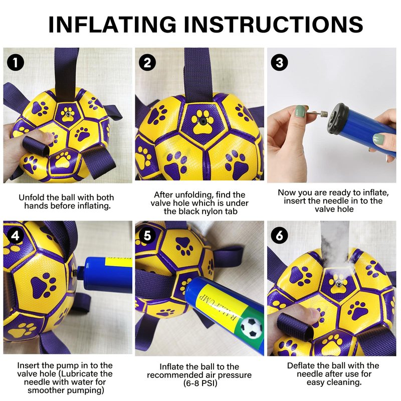 - PUMP & Needle Adapter Included: The hearding balls for dogs comes deflated. There's a a needle point adapter and a pump inside as well while other items in the same market only include a ball needle. The soccer ball dog toy is 6 inches in diameter, perfect for small & medium breeds, not for aggressive chewers.