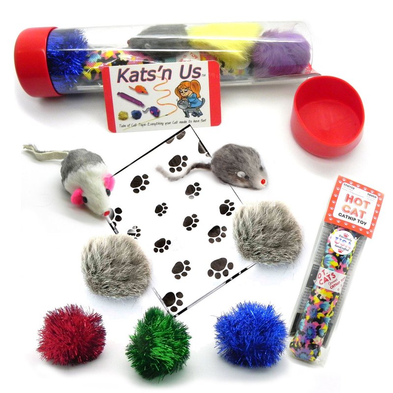 Kats'NUs Tube of Pet Toys. Everything your cat needs to have fun. These tubes are stuffed with fur mice, sparkle balls, organically grown catnip, rabbit fur pom poms, tissue paper, and much more. An assortment of cat toys for cats and kittens of all shapes, sizes, or stripes. Even the tube can be a toy. Exercise is one of the key elements for good kitty health. Try our tubes and watch the fun. Buy one for that favorite cat lover.