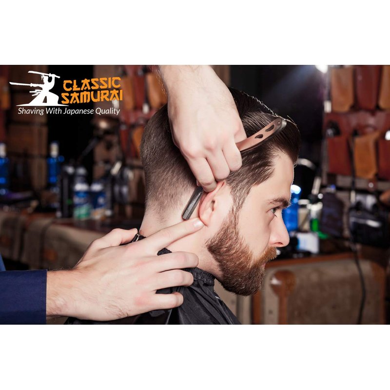 Classic Samurai Professional straight edge barber razor with Japanese quality is made from genuine surgical grade stainless steel! Perfect for Barbershop and Personal Usage. It offers another great option for a decent wet shave. It allows you get a quality straight razor barber style shave without all of the maintenance of a fixed straight edge razor. A new style of shaving without investing a lot of money. A great gift for someone who has mentioned interest in wet shaving.